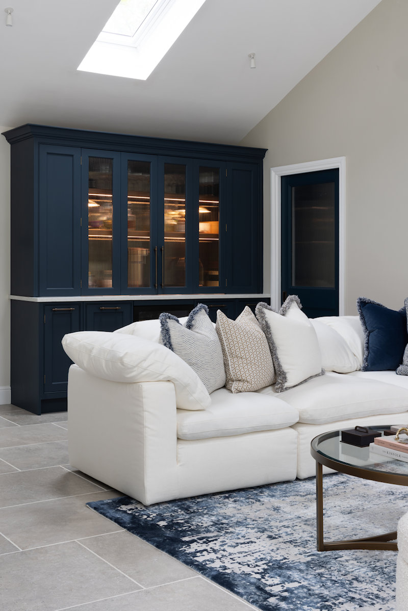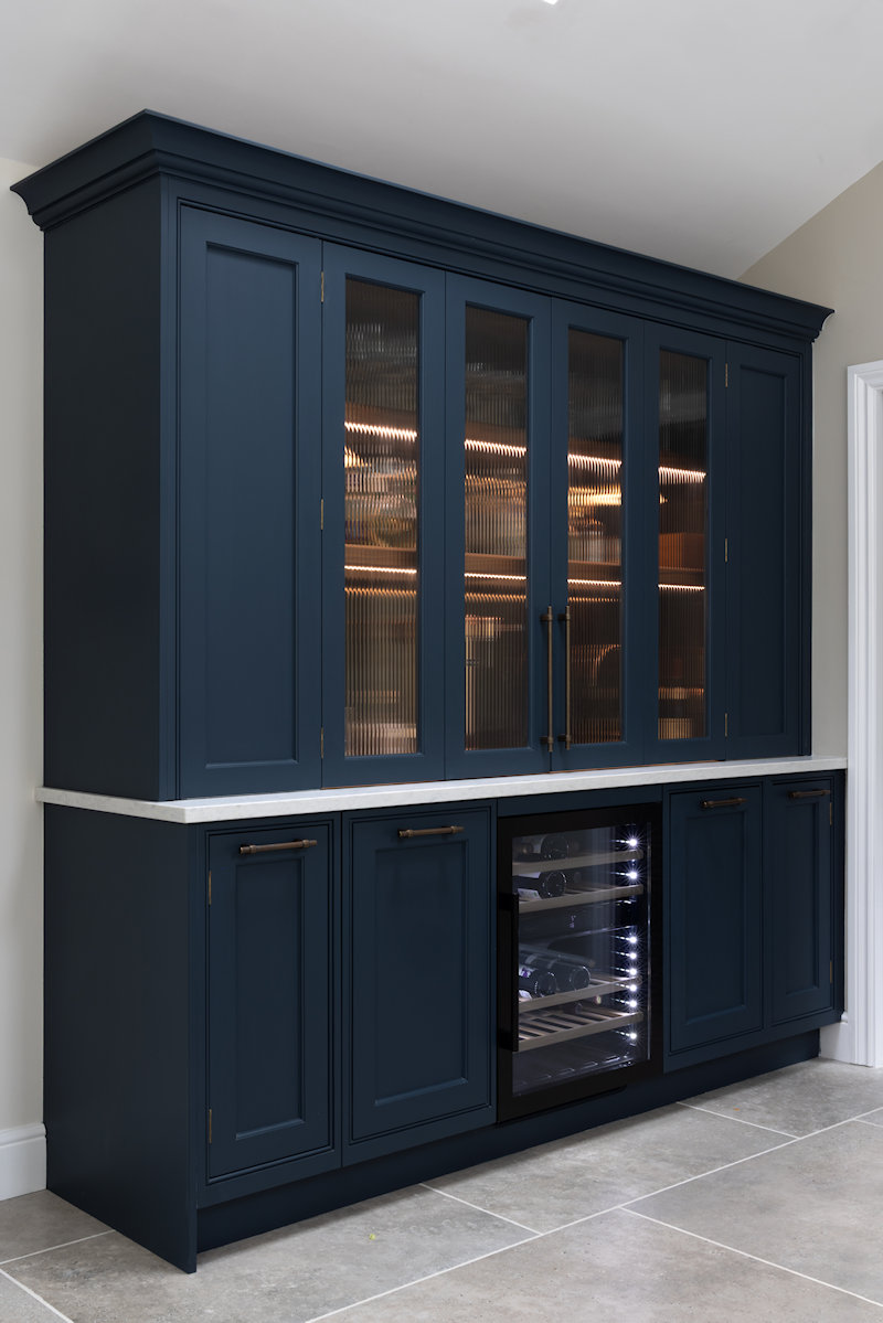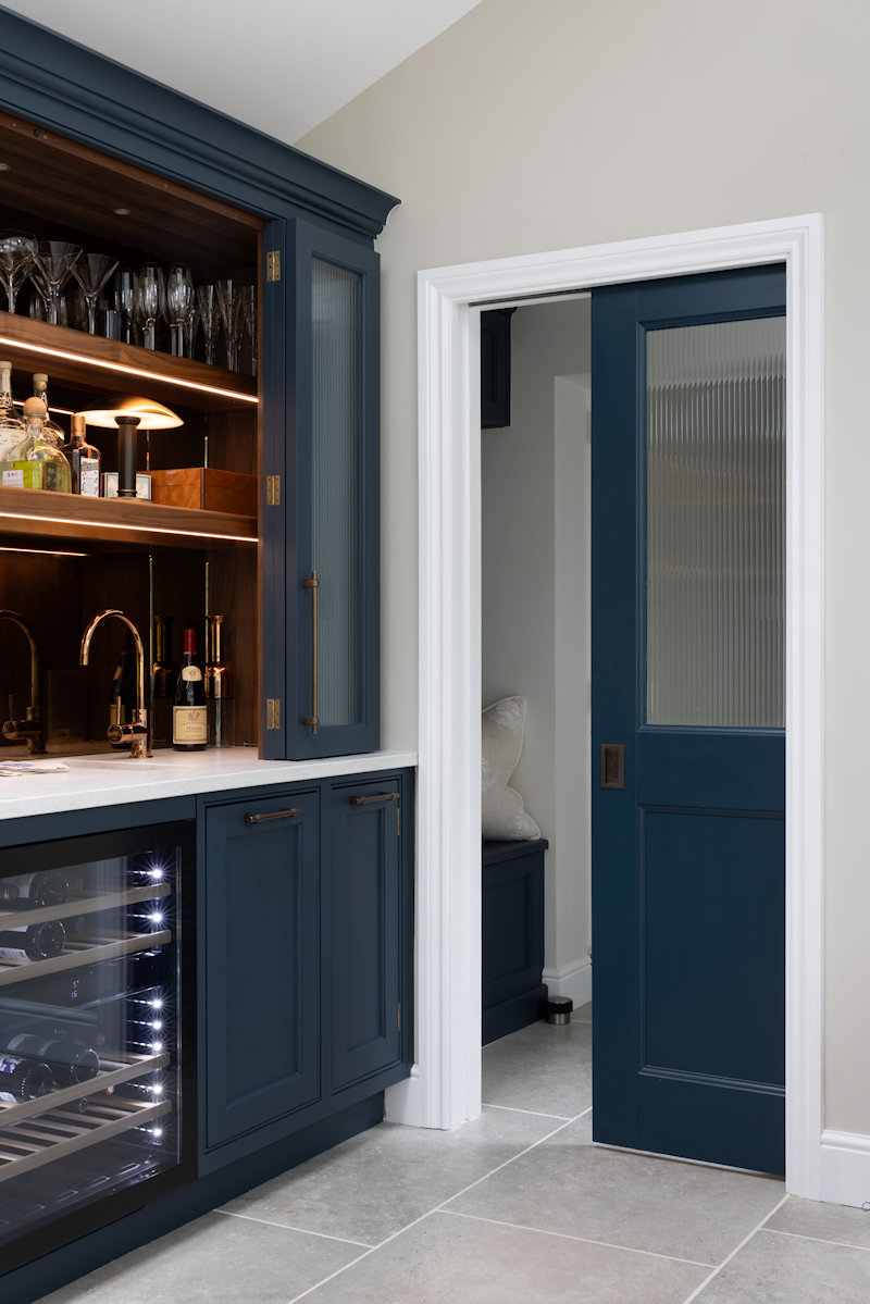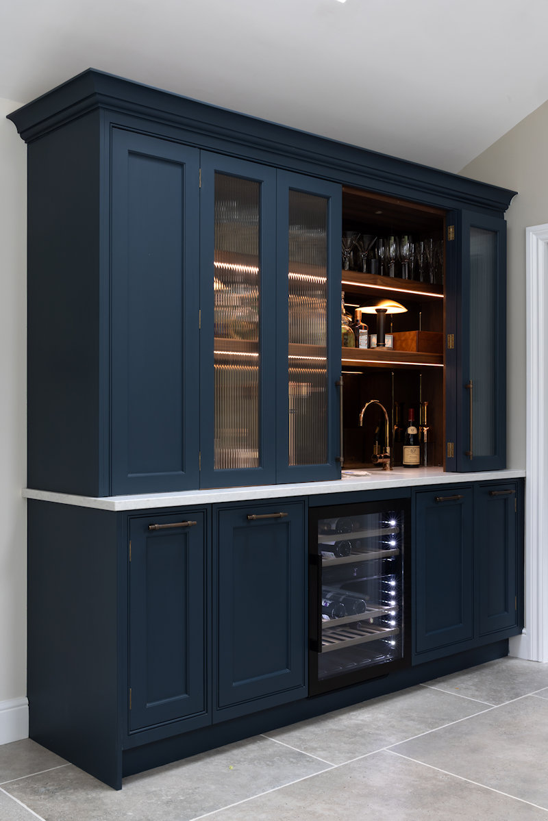 While designed to look as if it is freestanding, this home bar is fully built in. It includes electrics for lighting and to power the integrated wine fridge, and it is also plumbed-in to the mains water system. Separated into two parts by a 30mm Misty Carrara Satinato quartz worktop, which is the surface material also used in the kitchen, the upper cabinet features double bi-fold fluted glass glazed doors with butt hinges that fold back fully into the right and left-hand panels.