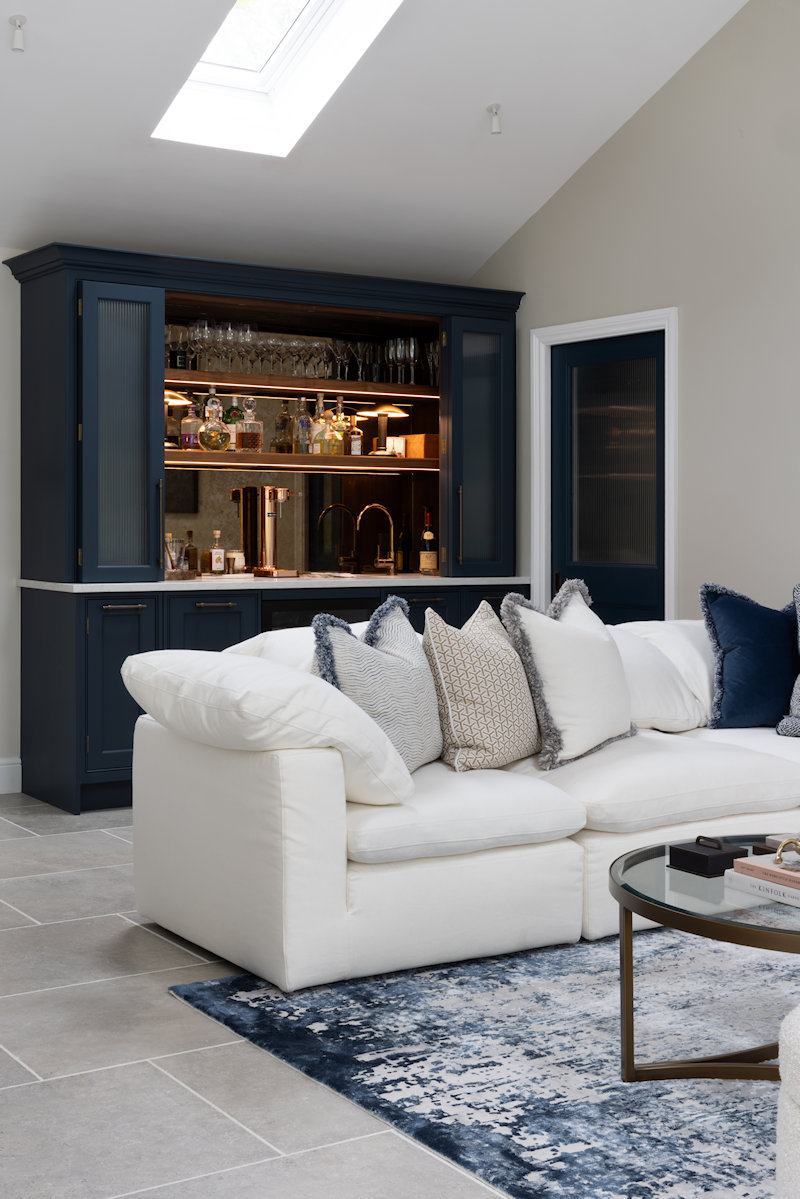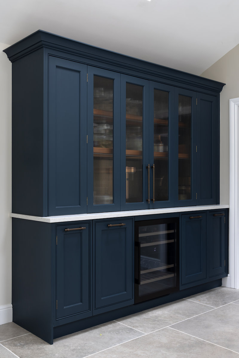 We were commissioned to design a Classic Bespoke Shaker Home Bar for the living space of a recently extended 1920’s single storey property in Haslemere, Surrey. This was part of a home refurbishment project where we also designed the kitchen, utility room and boot room. We were recommended to the clients by Hampshire-based interior designers, Emily Steen and Danielle Marsh, founders of Wells and Maguire, with whom we have collaborated on numerous previous projects, and who created the overall interior design scheme.