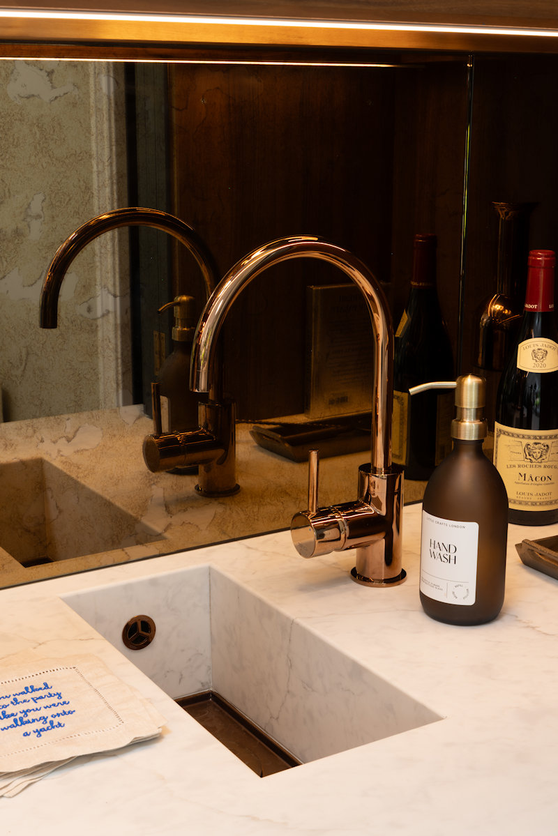 When folded, the interior bar is revealed, with a bronze antique mirrored glass back panel and two glazed walnut-edged shelves for glasses and cocktail items. These are above a deeper central area above the worktop that includes a slim copper undermount sink by 1810, with a lever tap in a matching finish on the right-hand side. LED spotlights are embedded at the top of the walnut veneered carcase, and LED strips are at the base of each shelf to create a stylish ambiance when entertaining. Beneath the worktop are storage cabinets to one side of a central 60cm integrated wine fridge by mQuvee, with a concealed 45cm integrated dishwasher by Siemens next to a bin cabinet on the other.