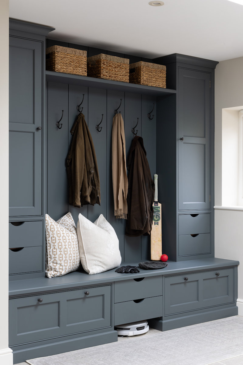 We design most boot rooms in a Shaker style because the aesthetic is clean and unfussy. However, we can create contemporary versions, if required. We recommend a boot room is painted as it will be more convenient to clean and maintain, and, over time, any scuffs and marks can be easily touched up.
