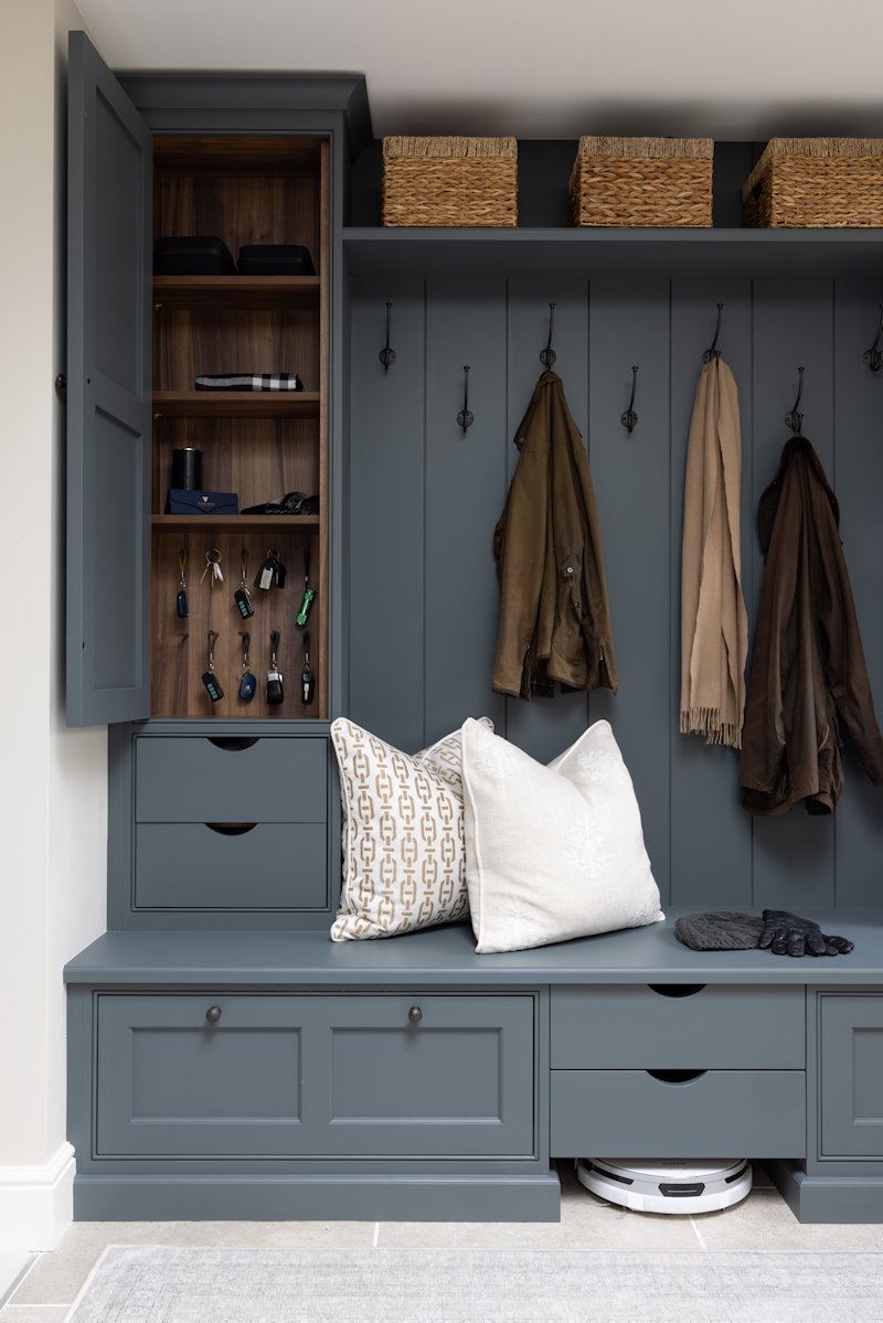 Our Classic Bespoke boot room design will feature hidden storage under bench seating, with open pigeon hole storage for hats, scarves, gloves, umbrellas, dog leads, muddy shoes and of course, boots. We create wall mounted hooks to hang outerwear in smaller rooms or we install full hanging rails for coats and jackets in larger areas. We can also include top boxes for sports equipment such as equestrian or cycling helmets and we can also include drawers and baskets for additional storage. We also design boot rooms with plugs, phone chargers and sockets, and we will even create a special home for your robot vacuum cleaner.