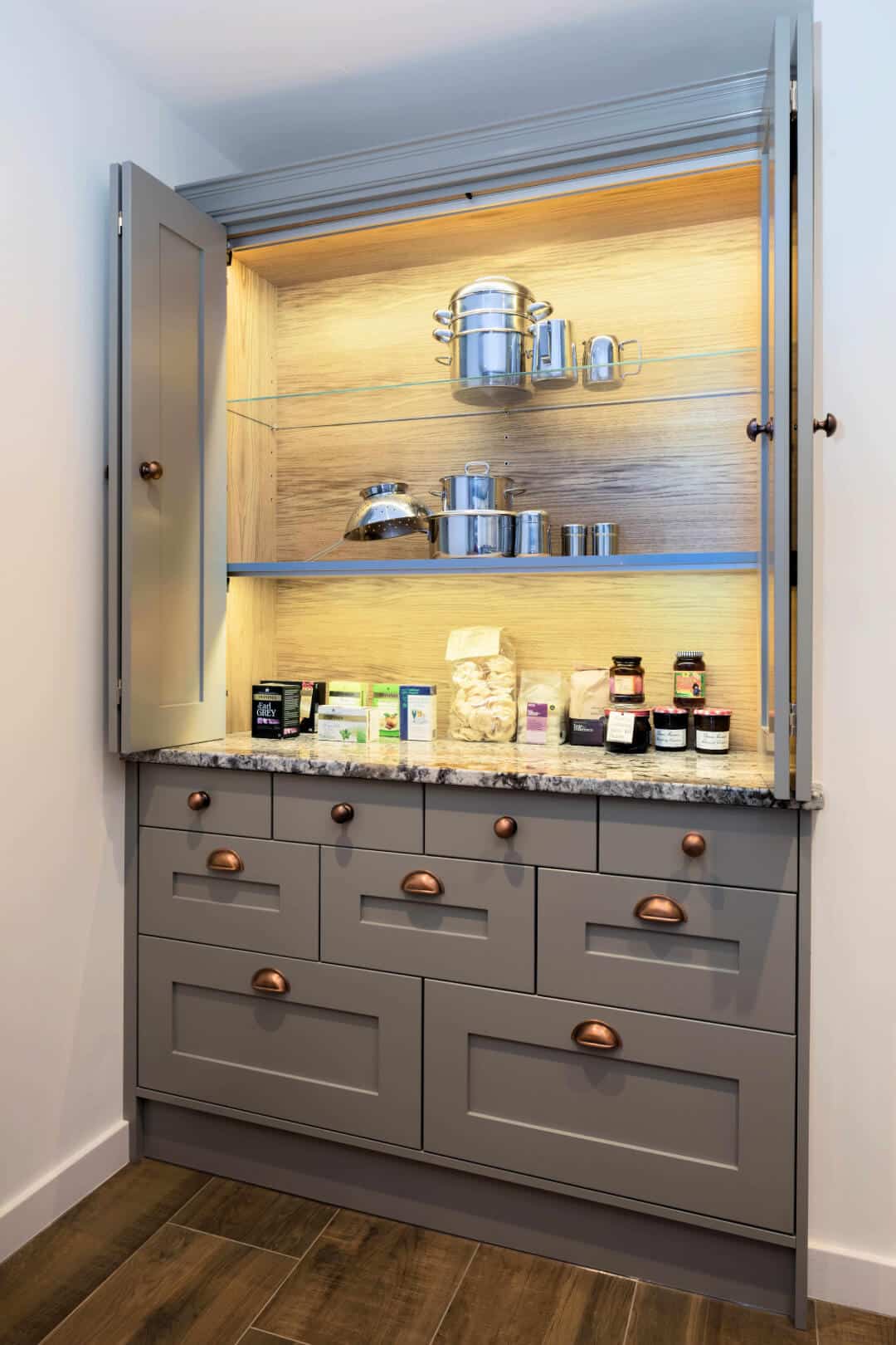 We design beautiful traditional pantries with integrated drawers at different height levels for you to store all your kitchen items, cutlery, tablecloths and napkins. We can include a worktop and electrical points within the pantry if you want a separate tea station, together with shelving designed for jars and tins.