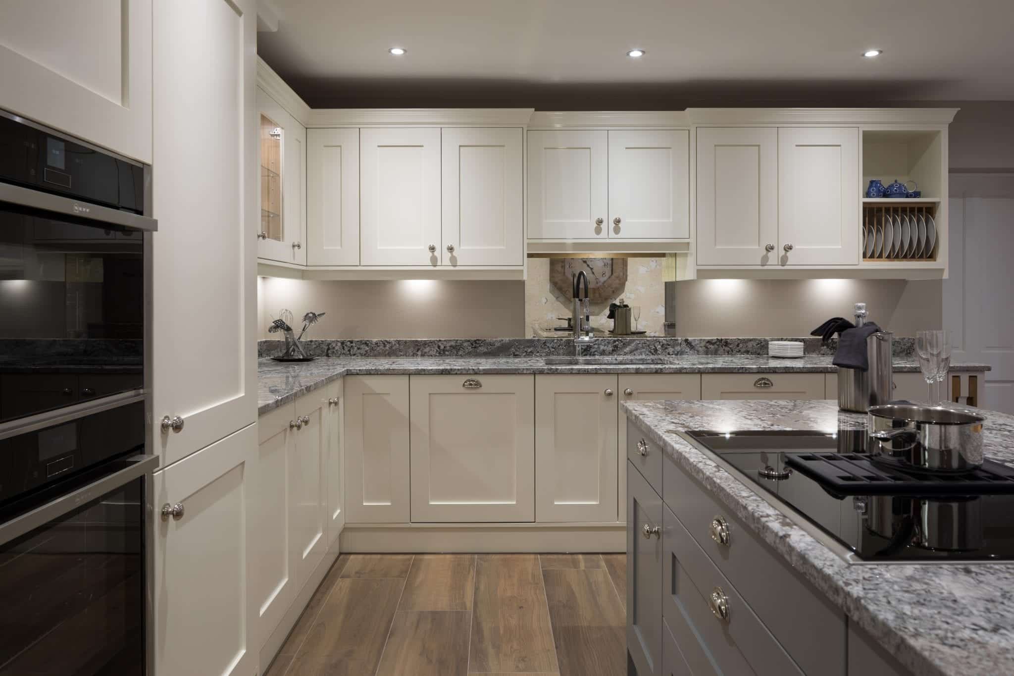 At Searle & Taylor, we work with our clients to choose the perfect colours they require for their handmade and hand-painted kitchens, and we recommend a number of paint manufacturers from Farrow and Ball to a trade paint range from Finland that we love called Valtti. We also recommend paints from Sanderson, Paint and Paper Library and the Little Greene Company plus countless others. All premium paints provide great coverage, which is important for the long-term look of your kitchen. Meanwhile, we know that mainstream manufacturers like Dulux now offer a paint-matching service, and as long as we can test the paint in advance, we are happy to work with whichever paint manufacturer you want to choose for your hand-painted kitchen.